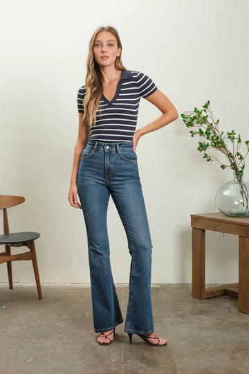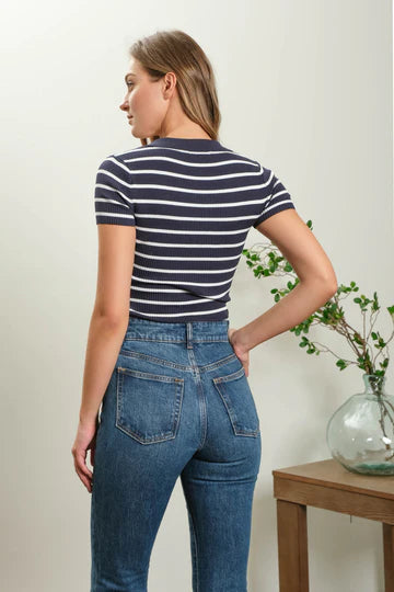 SPLIT NECK COLLARED RIBBED KNIT SHORT SLEEVE STRIPE PRINT 70%VISCOSE, 30%POLYESTER