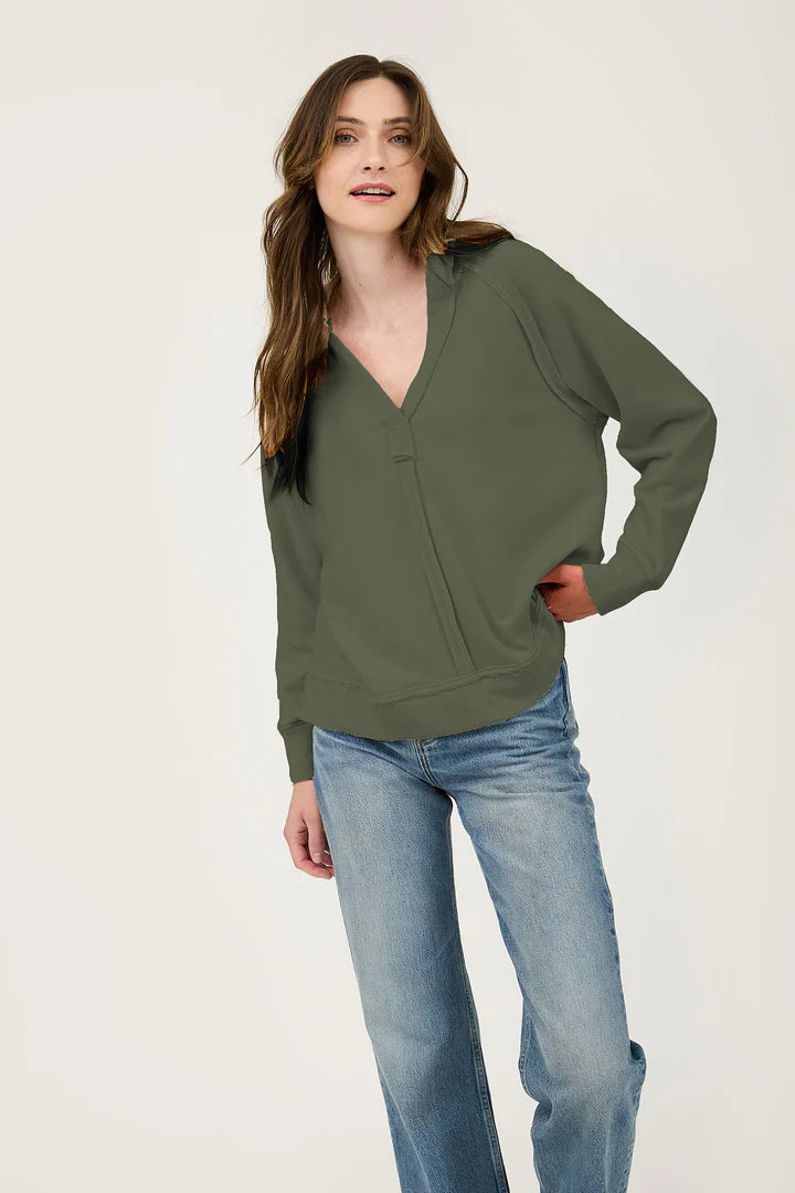 V NECK HOODED RAGLAN LONG SLEEVE RAW EDGE SOLID KNIT TOP SELF: 60%COTTON 40%POLYESTER CONTRAST: 58%COTTON 39%POLYESTER 3%SPANDEX