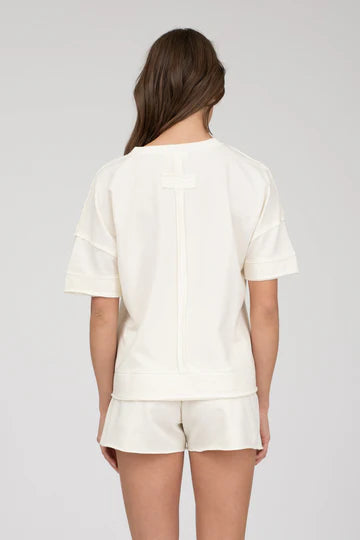 Washed Split Neck Patchwork Short Sleeve Knit Top