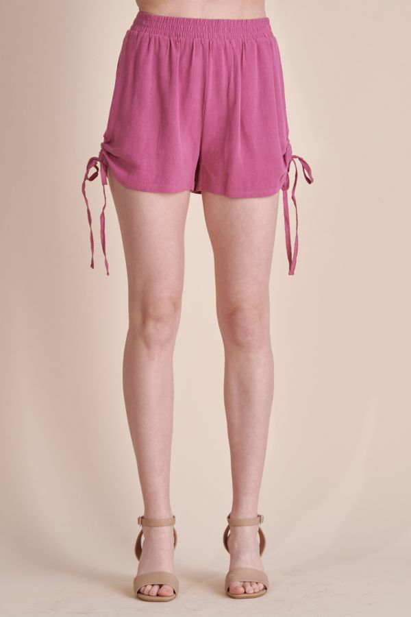 Ruched Sides, Elastic Waist Linen Shorts with Pockets, 60% Cotton, 40% Linen