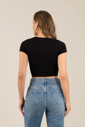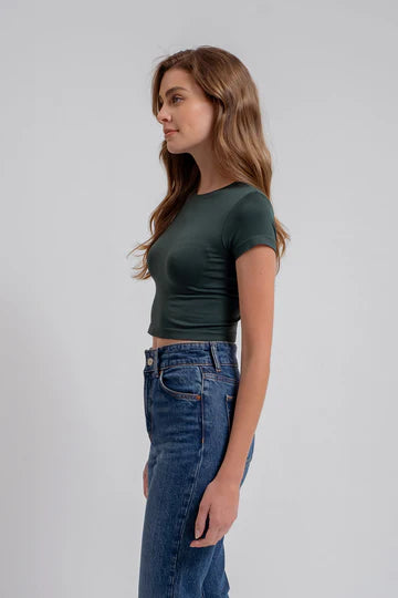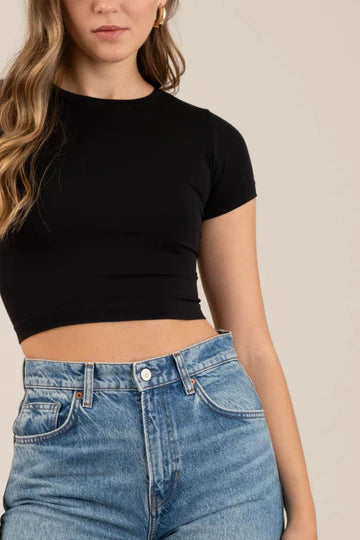 ROUND NECKLINE SHORT SLEEVES FITTED SOLID NOT LINED KNIT TOP 92% NYLON, 8% SPANDEX