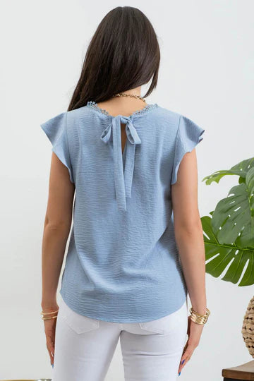 V NECKLINE LACE TRIM SHORT RUFFLE SLEEVES BACK SELF TIE U HEM SOLID NOT LINED SELF: 100%POLYESTER CONTRAST: 100%POLYESTER