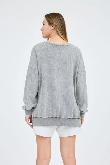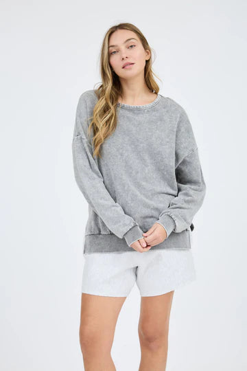 Round Crewneck Long Sleeve DROP SHOULDER ACID WASHED TONES MAY VARY PULLOVER SWEATER KNIT TOP SELF: 60% COTTON, 40% POLYESTER CONTRAST: 57% COTTON, 38% POLYESTER, 5% SPANDEX
